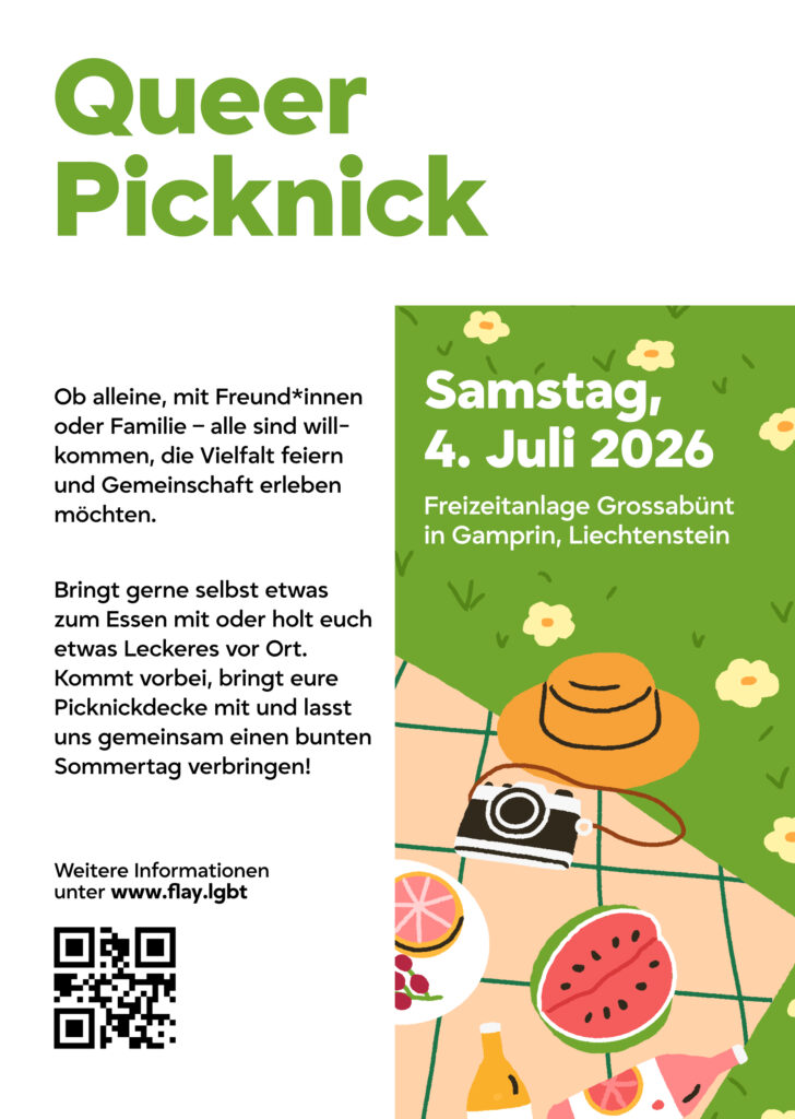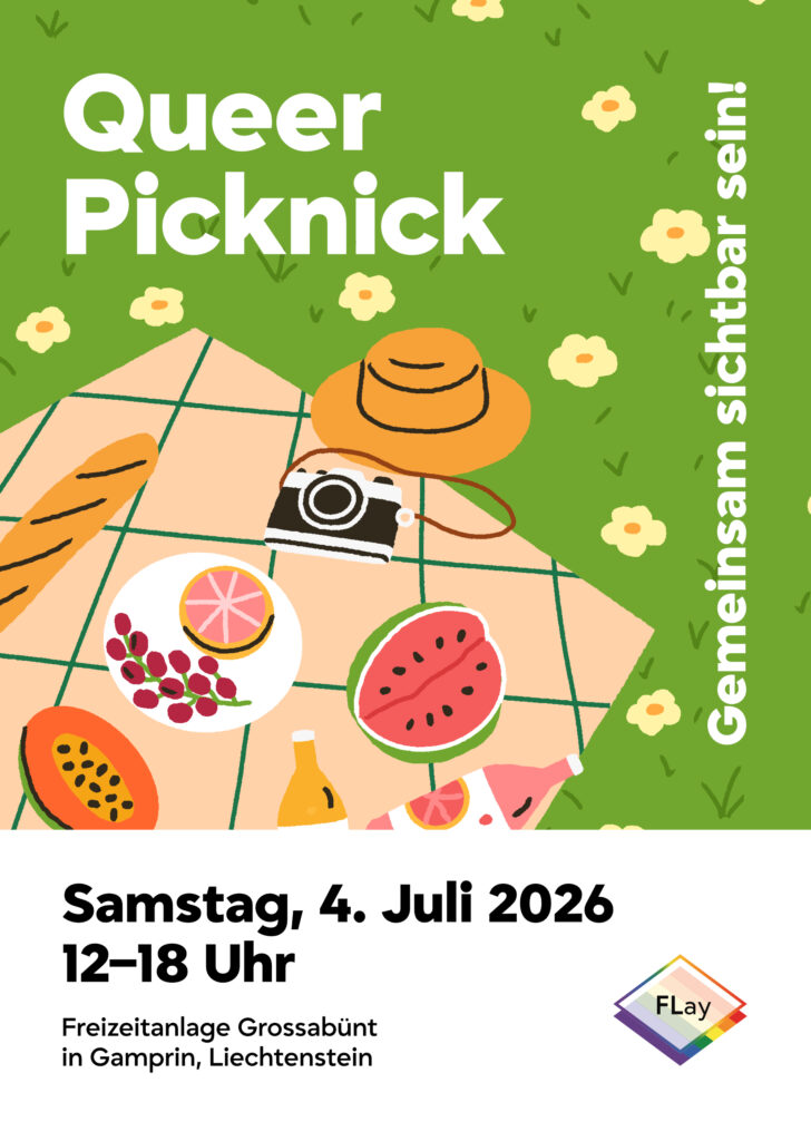 Das Queer Picknick (Sommerfest) findet am Samstag, 4. Juli 2026 von 12–18 Uhr bei der Freizeitanlage Grossabünt in Gamprin, Liechtenstein statt.
